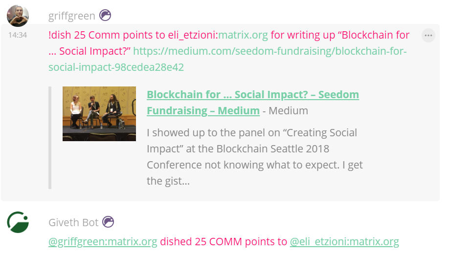 Giveth began by using Slack, but switched to Riot to support Matrix's decentralized, open-source model, which which aligns far more with Giveth's own business model and values. The Giveth Bot is a great example of how Matrix enables users to build their own solutions to problems. In the future, we hope that the Giveth Bot will be able to interact directly with the Ethereum Blockchain, and that more analytics and measurement tools can be incorporated. And of course, we welcome any and all feedback on the Giveth Bot!